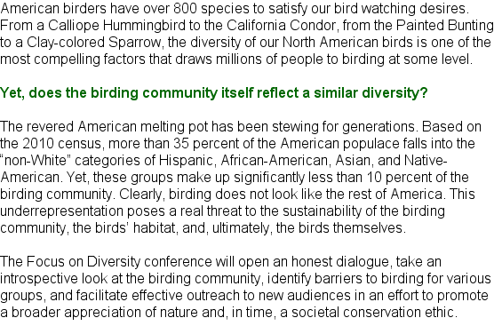 | The Focus on Diversity Conference is being made possible through the support of... American Birding Association BirdWatcher's Digest Clemson University Eagle Optics Great Birding Projects Houghton Mifflin Harcourt Kaufman Field Guides Minnesota River Valley Audubon Chapter Stackpole Books U.S. Fish and Wildlife Service Wild Bird Centers of America Sponsorship opportunities for the Focus on Diversity Conference are available! |